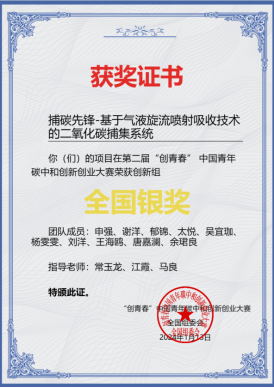 2024年1月11日至13日,第二届“创青春”中国青年碳中和创新创业大赛终审决赛在中国石油大学(北京)落下帷幕。在常玉龙等3位老师的指导下,我院2021级碳中和技术创新班本科生申强带领团队,凭借《捕碳捕碳先锋——基于气液旋流喷射吸收技术的二氧化碳捕集系统》项目从75个决赛项目中突出重围,斩获创新组全国银奖。