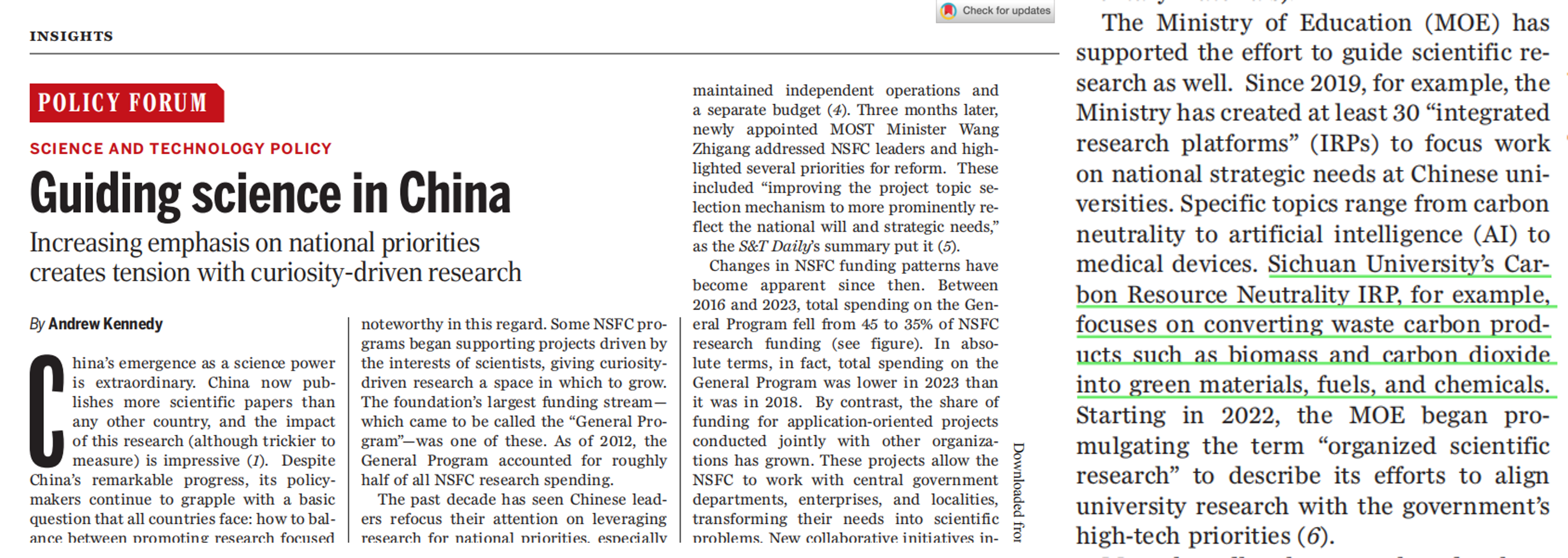 作者在阐述“中国路线——鼓励科学家将国家战略与好奇心驱动结合起来”这一重要论点时,正面肯定了教育部创建“关键核心技术集成攻关大平台”在推动高校科研与国家战略需求对接中发挥的作用,并以yl7703永利集团“资源碳中和关键核心技术集成攻关大平台”为例,分析了其在将生物质和二氧化碳转化为绿色材料、燃料和化学品方面可能发挥的作用。