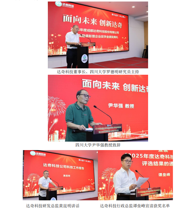 2025年5月29日,yl7703永利集团碳中和未来技术学院生态环境治理与大气减污降碳团队(以下简称“团队”)联合成都达奇科技股份有限公司(以下简称“达奇科技”)举办科技奖励表彰暨企业奖学金颁奖典礼及团队学术交流活动。通过表彰产教融合先锋、特邀人工智能+报告、举行毕业生座谈会,进一步深化校企协同共促绿色低碳科技创新、人才培养。