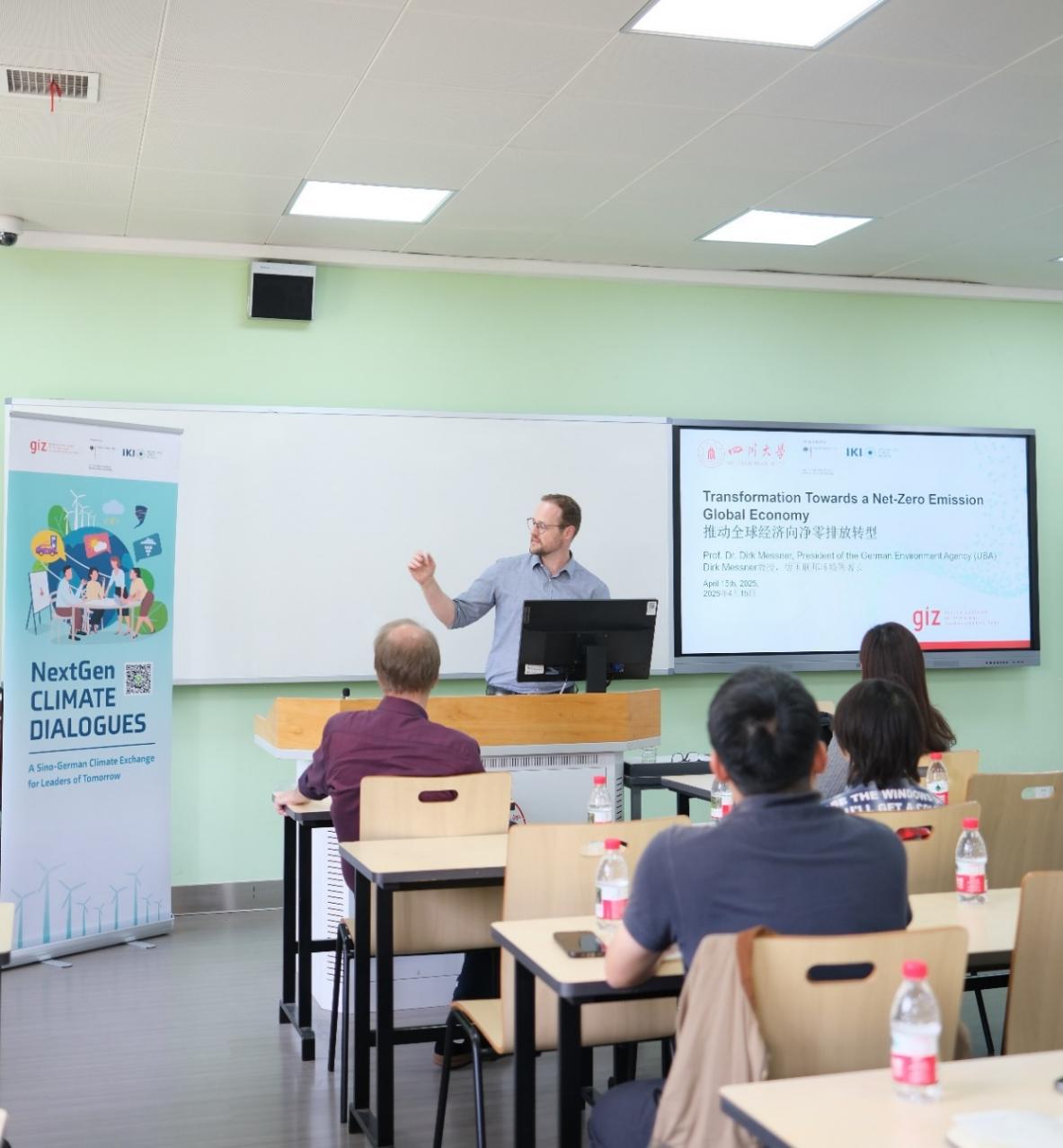 为贯彻落实碳中和国家重大战略,促进碳中和领域科学研究和人才培养,2025年4月15日,“yl7703永利集团碳中和未来技术青年学者论坛”(第四十六期)在yl7703永利集团江安校区一教C座106顺利召开。德国环境署署长德克·梅森纳(Dirk MESSNER)教授率团访问yl7703永利集团并为与会师生作报告。此次报告是德国国际合作机构(GIZ)在德国外交部的支持下开展的未来气候对话系列讲座。本次论坛由我院院长助理代忠德教授主持。
